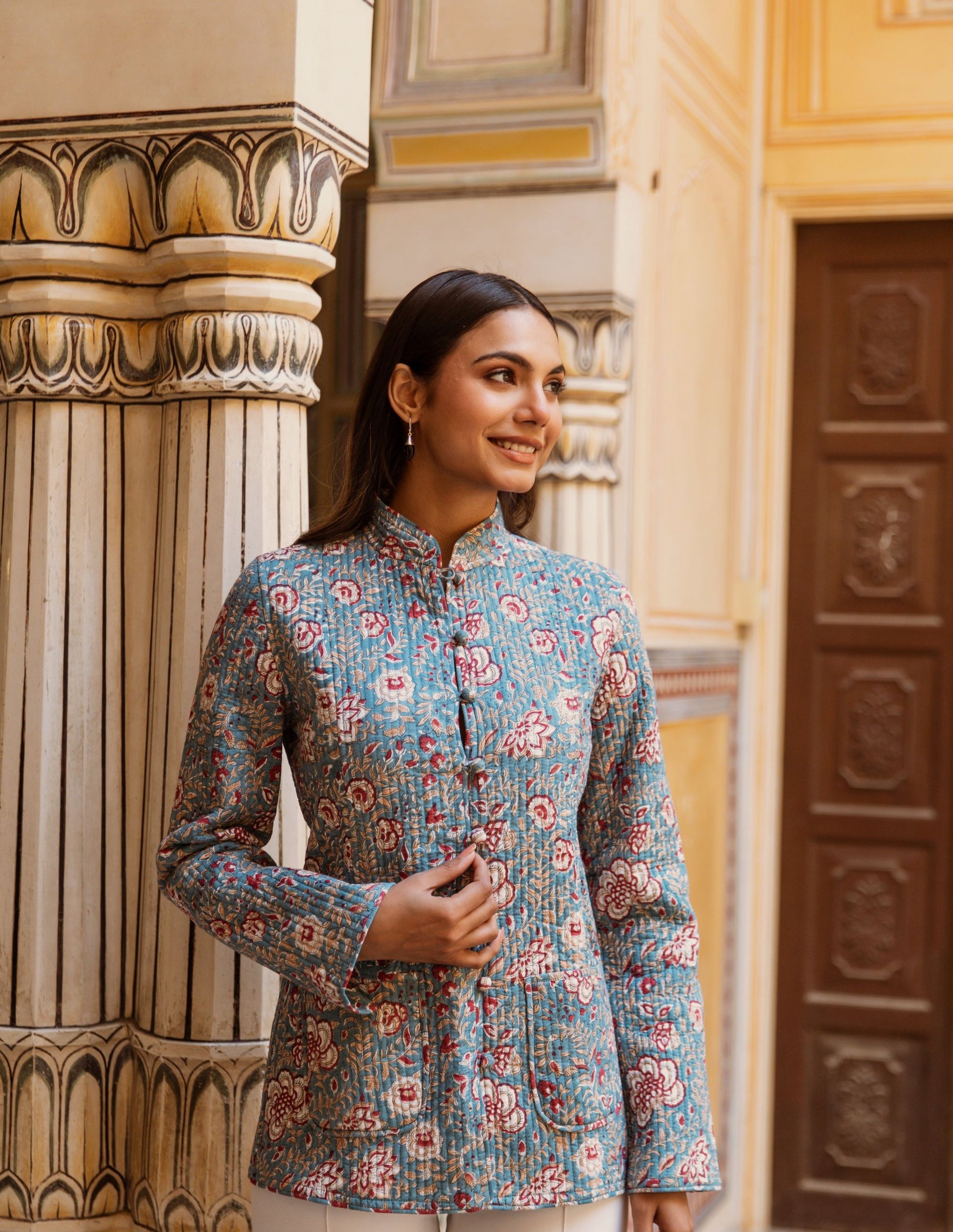 The Indian cotton quilted jacket is a versatile and stylish piece that offers comfort and style.