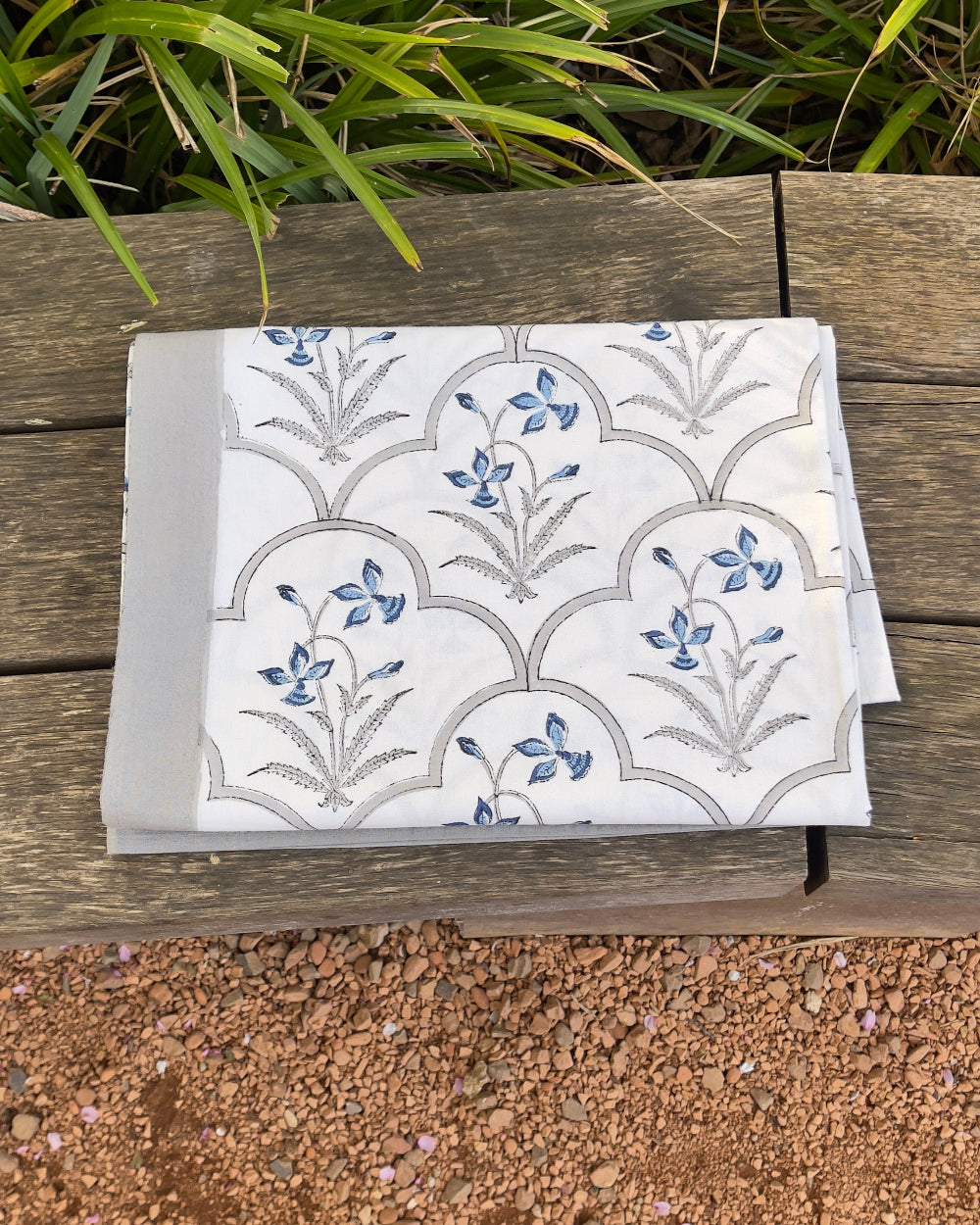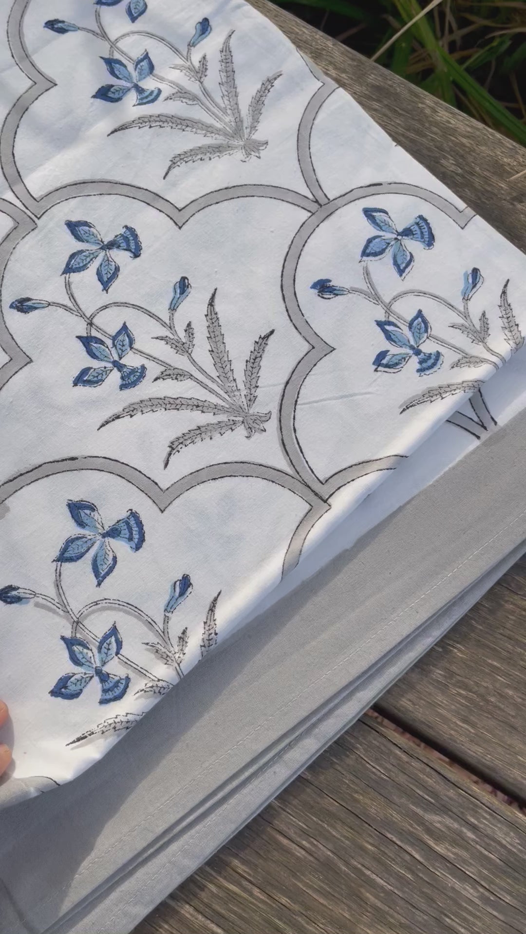 Apportez une touche de fraîcheur à votre table avec la nappe Bleu Jodhpur. Inspirée des motifs floraux moghols, elle allie des petites fleurs bleues stylisées à un fond blanc lumineux, encadré de bords gris doux. Idéale pour une décoration épurée aux accents traditionnels.