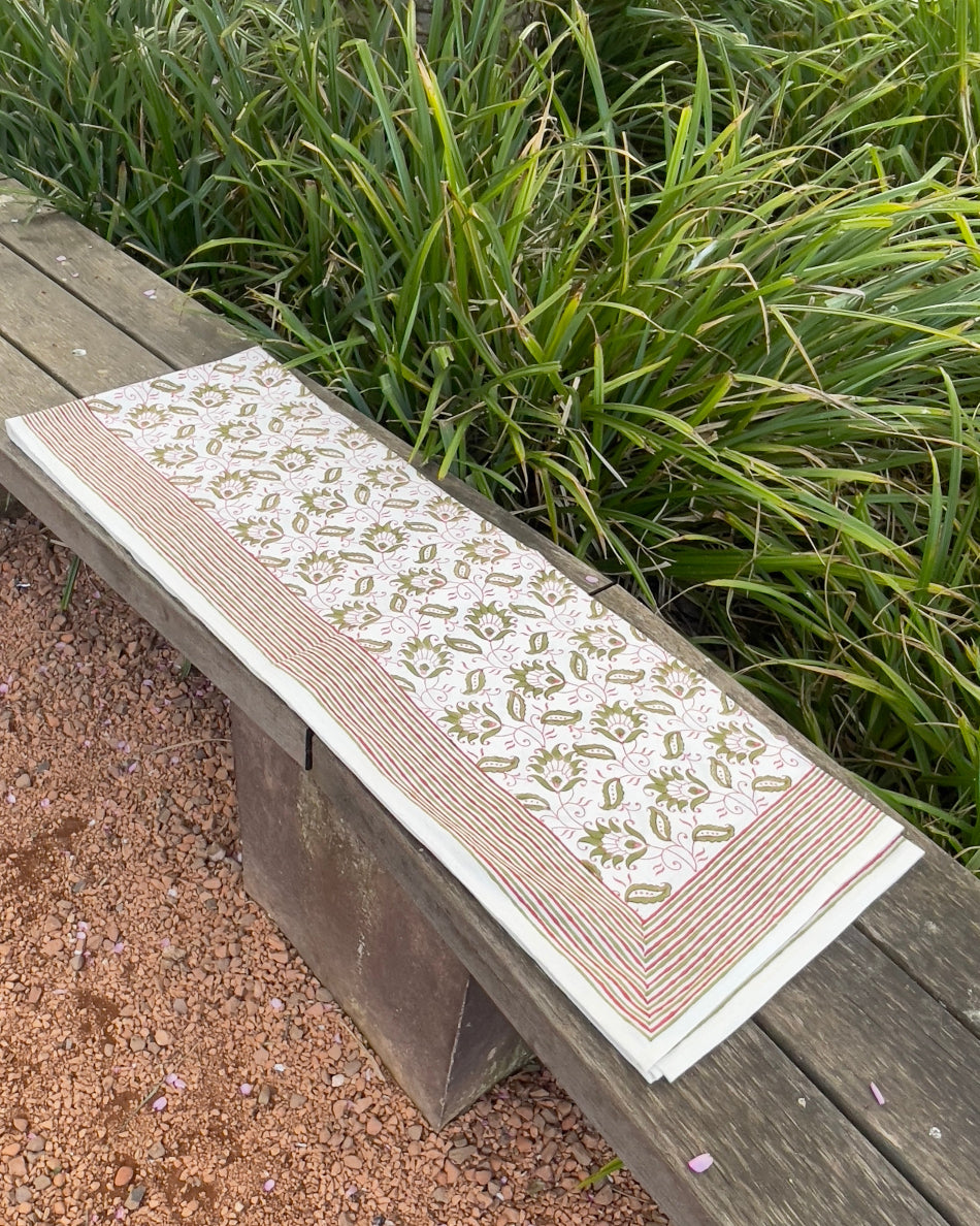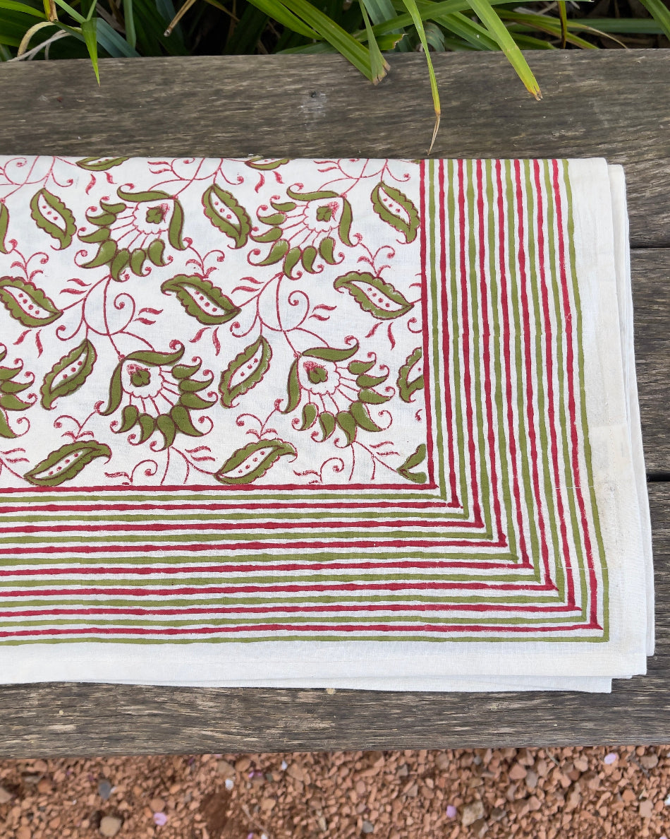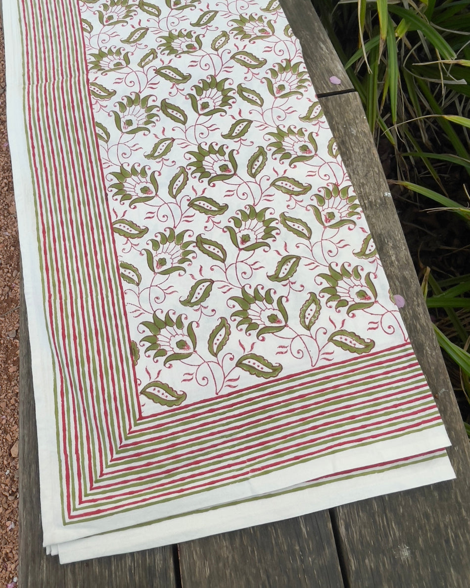Nappe Florale Vert Olive et Blanche – Impression Artisanale Indienne