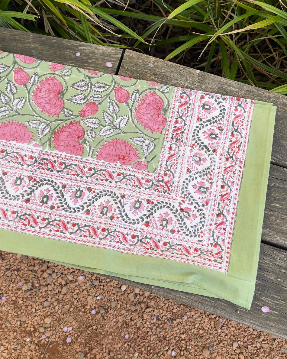 Nappe Jaipur Vert – Motif floral rose imprimé à la main
